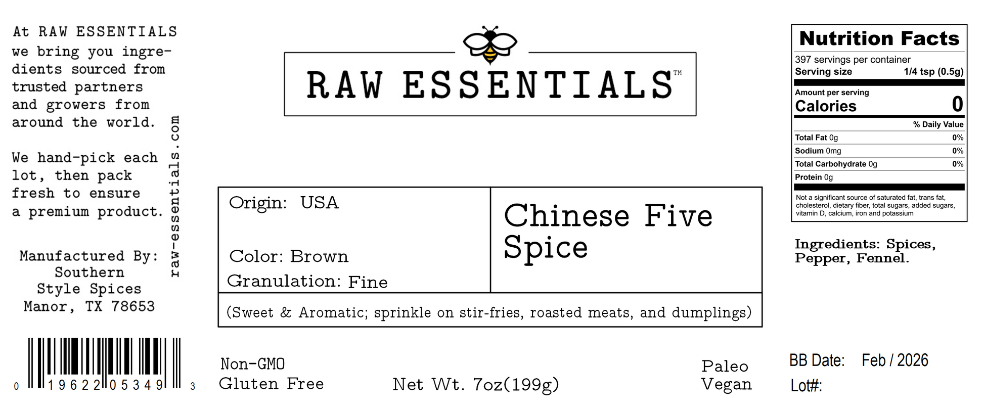 Experience the timeless flavor of Raw Essentials Chinese Five Spice, a blend that perfectly balances all five tastes — sweet, sour, bitter, salty, and umami. This aromatic seasoning has been a cornerstone of Chinese cuisine for centuries, bringing warmth, depth, and a touch of sweetness to every dish.