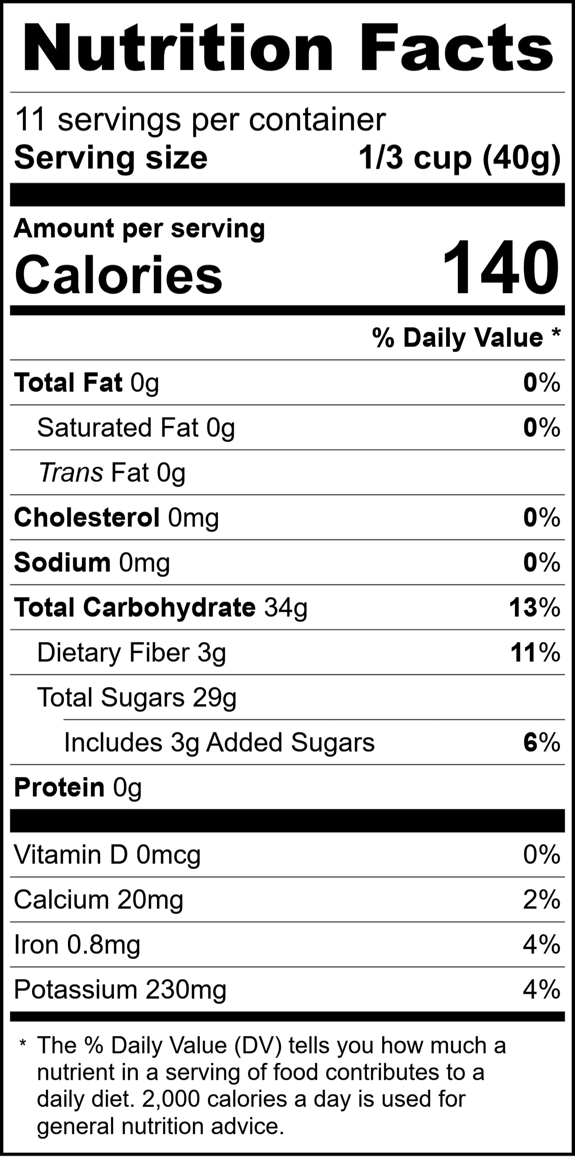 Ingredients: Dates, Dextrose. Contains: Sulfites Warning: Product may contain occasional pit or pit fragment