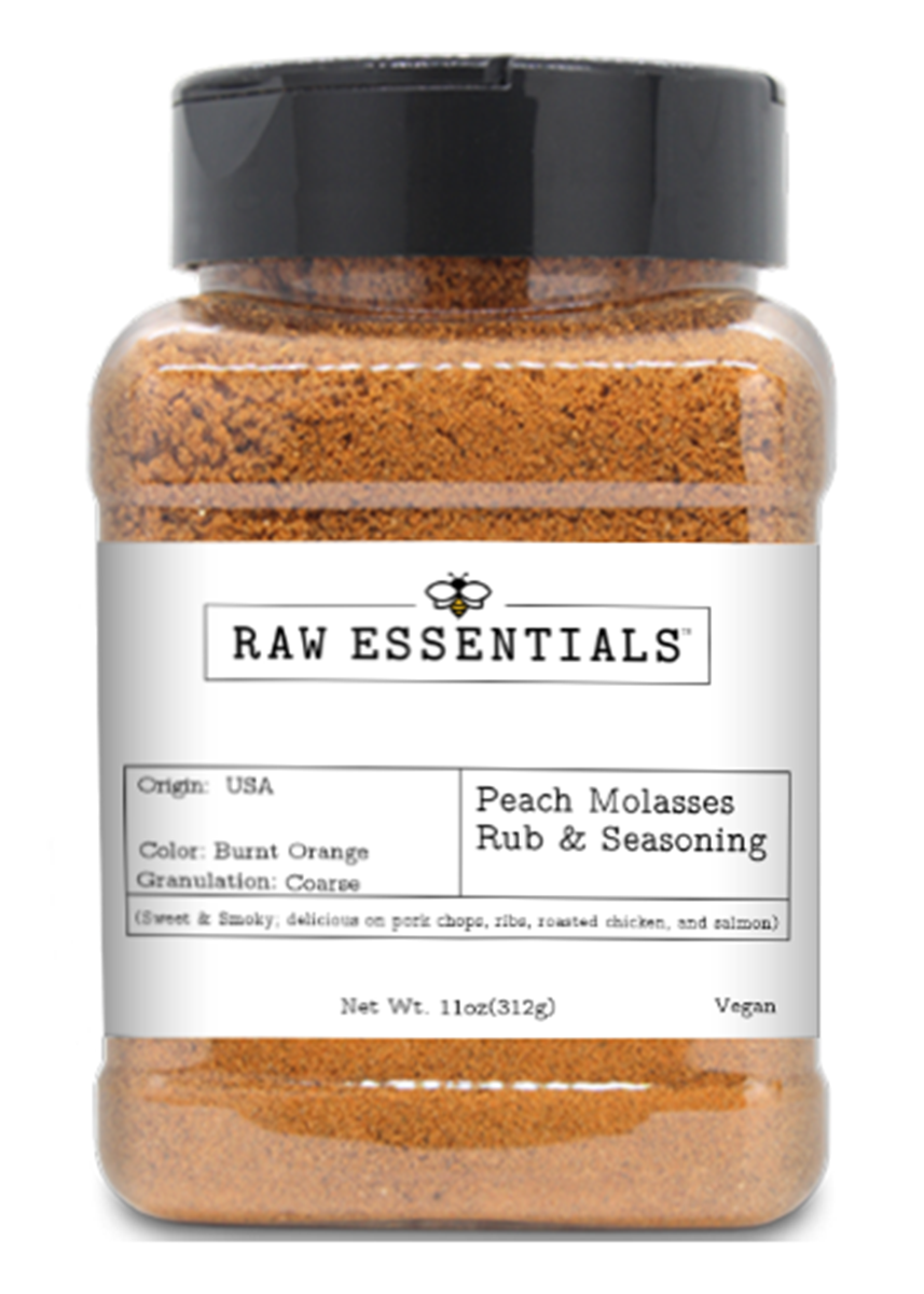 Bring rich Southern-inspired flavor to your kitchen with Raw Essentials Peach Molasses Rub & Seasoning — the perfect blend of sweet, smoky, and fruity notes. This versatile seasoning creates mouthwatering dishes like Peach Molasses Baby Back Ribs and can be used as a dry rub or transformed into a glaze. For a glaze, mix 1 cup of molasses, ¼ cup of bourbon (optional), and 4 tablespoons of Peach Molasses Rub & Seasoning, then brush on during the last 5 minutes of grilling.